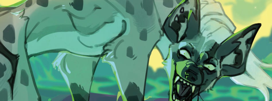 My hyena king from Clawstar—a different project, different genre, same architecture—takes this further. Chaa is a literal scavenger—second-tier male in a matriarchal clan, destined for subservience and scraps. When the lions’ “righteous cull” murdered his queens, his sisters, his matriarchs, he filled the power vacuum not with nobility or tradition but with teeth and terrifying clarity.